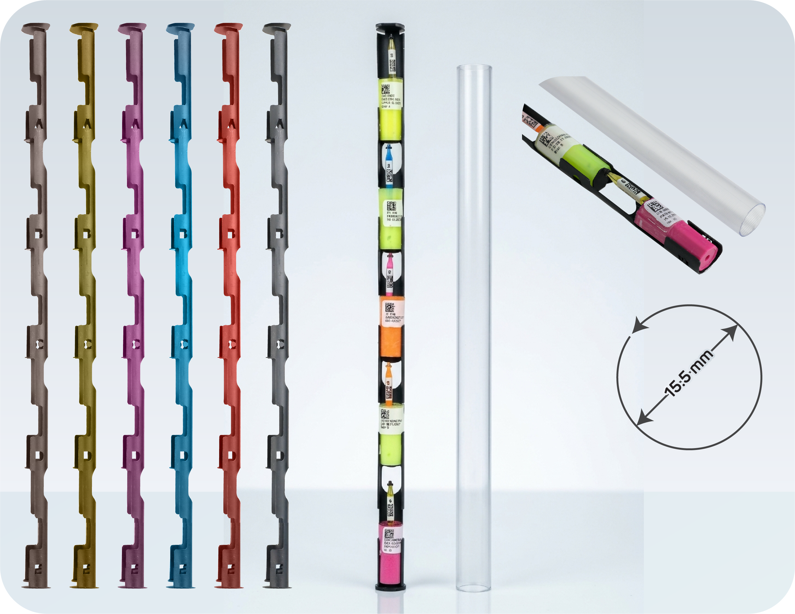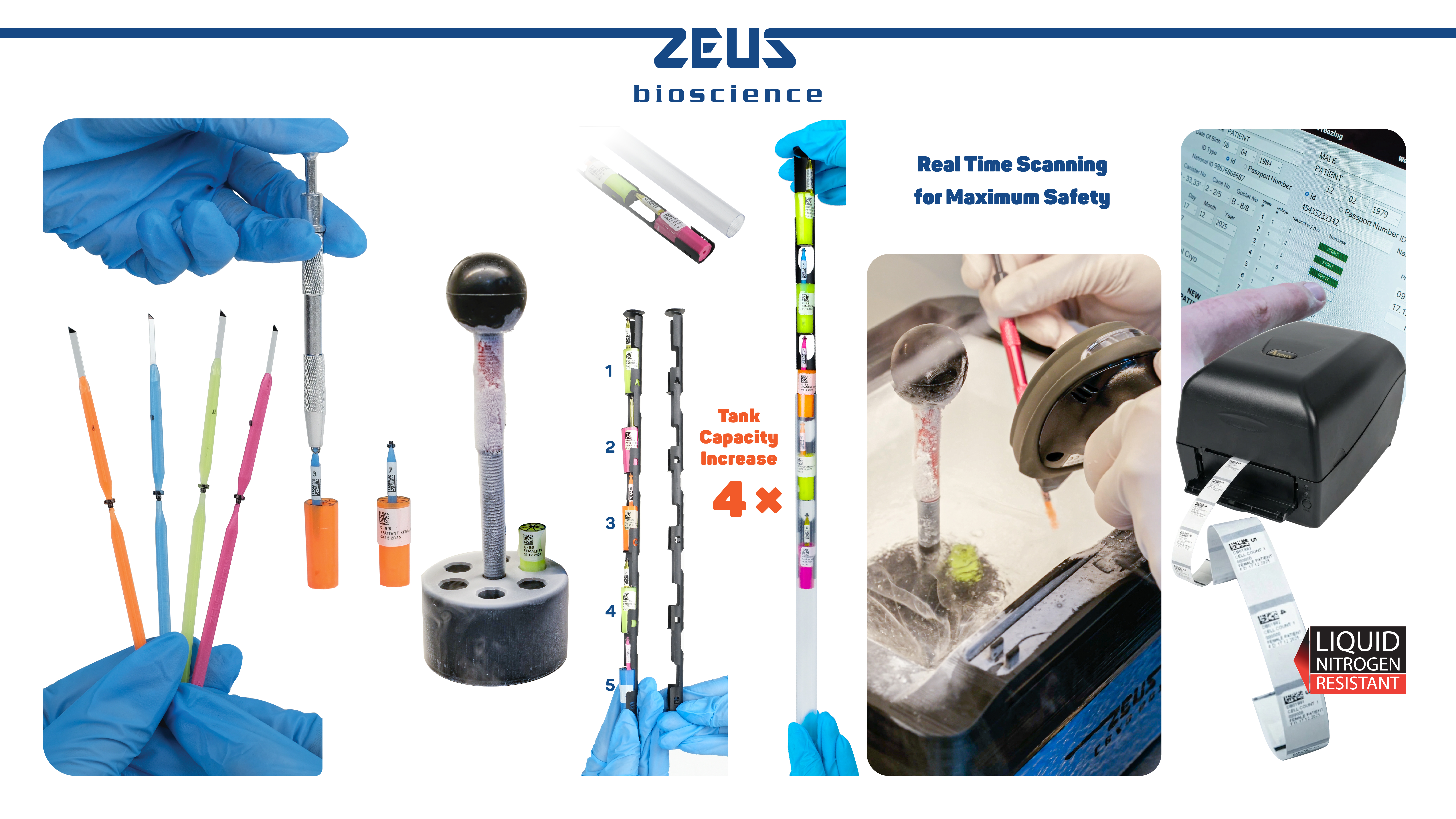 The Zeus Smart Cryo-Tools system is an integrated set of intelligently designed tools developed to improve safety, traceability, and workflow efficiency during the cryopreservation and storage of embryos and oocytes. By utilizing patented shortenable Smart Straws, the system can quadruple the storage capacity of existing liquid nitrogen tanks without requiring new hardware. The octagonal goblet design ensures that samples remain submerged in nitrogen during handling, maintaining a continuous cryogenic chain and protecting delicate biological materials from thermal shock. To ensure maximum safety and error-free identification, the system utilizes specialized liquid nitrogen-resistant barcodes that remain durable and readable even while submerged in nitrogen. This integration provides full in-tank addressing and library location indexing, enabling the system to track the exact tank, canister, cane, goblet, and straw location of every sample. Consequently, for the thawing process, users can utilize the wireless barcode reader to pinpoint and verify sample locations in real time without the need to remove them from the nitrogen, ensuring the correct embryo or oocyte is selected before every procedure.