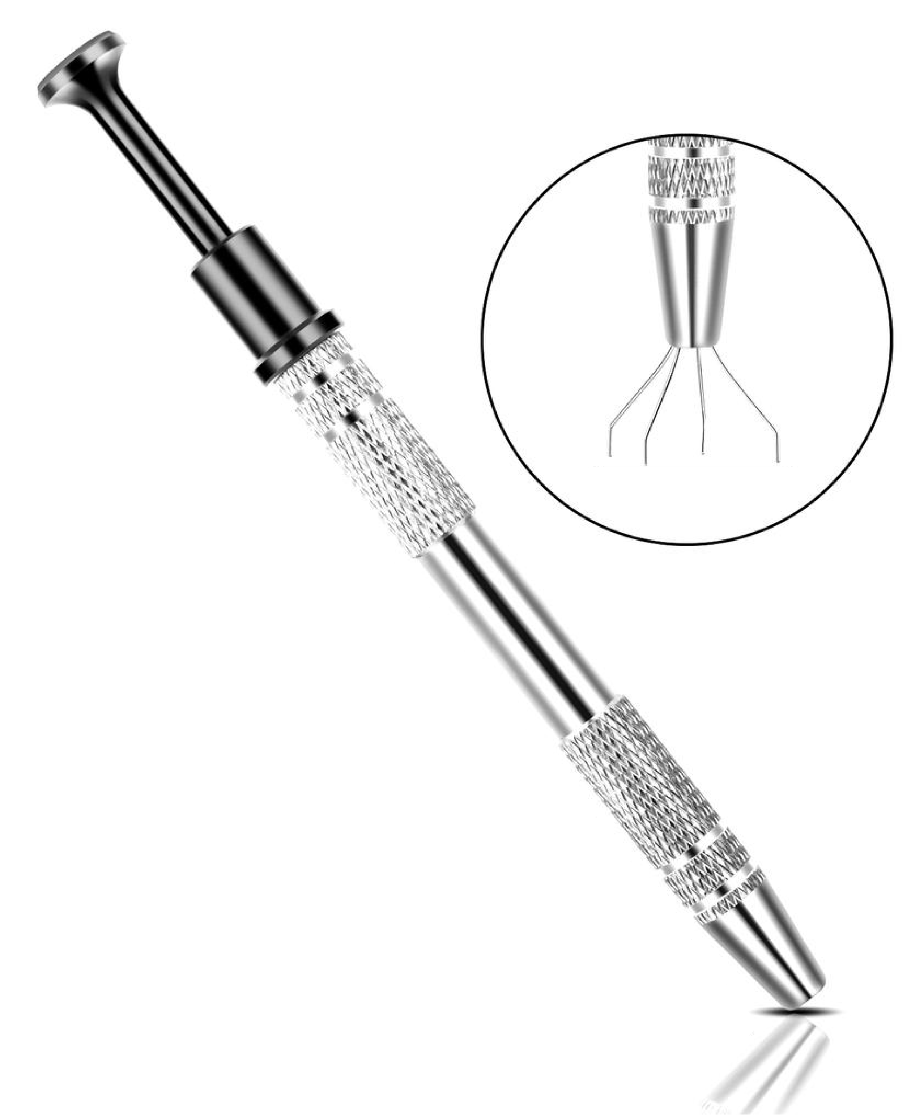 A precision handling tool with a mini four-claw pickup mechanism for safe manipulation and extension of shortened straws inside liquid nitrogen.