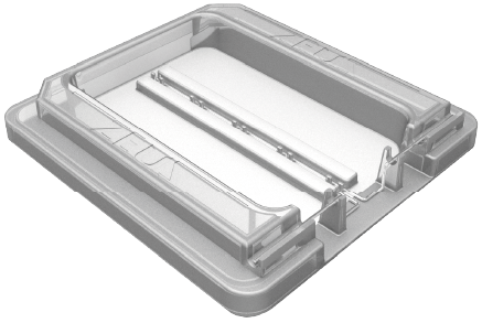 Single-use sterile petri dish with integrated metal electrodes and four separate cell pools, specifically used for verification during oocyte manipulation.